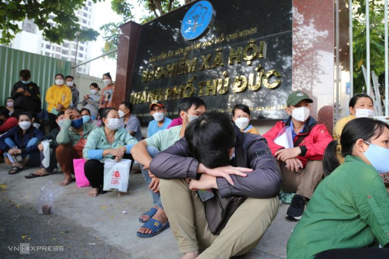 Lao động mệt mỏi vì phải xếp hàng từ rạng sáng chờ nộp hồ sơ rút BHXH một lần tại cơ quan Bảo hiểm xã hội TP Thủ Đức, TP HCM, tháng 4/2022. Ảnh: Đình Văn
