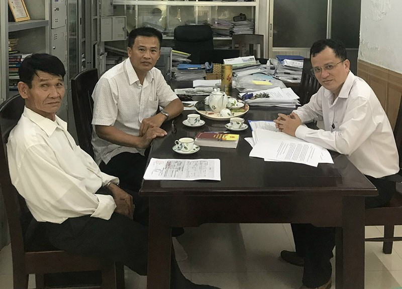Ông Trần Bê (bìa trái), ông Huỳnh Chiếm Hoạnh (giữa) và luật sư làm việc bồi thường oan. (Ảnh: PLO)