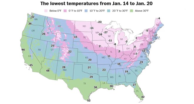 Tại khu vực Thượng Trung Tây, nhiệt độ ban đêm có thể rơi xuống -23 đến -29 độ C, thậm chí -34 độ C trong kịch bản lạnh nhất.