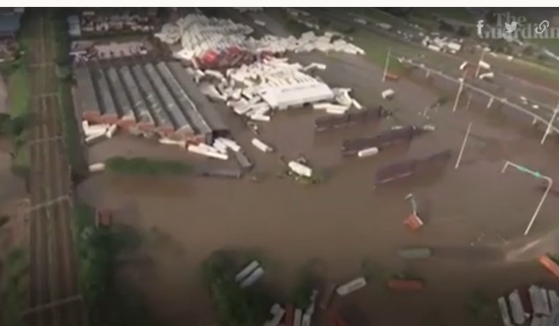 Cảnh quay từ trên không cho thấy cơ sở hạ tầng bị phá hủy, sườn đồi bị lũ cuốn trôi do mưa lớn ở thành phố Durban, Nam Phi. Chụp từ Video: Guardian.
