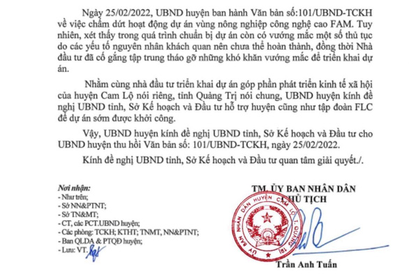 Tối 1-3, UBND huyện Cam Lộ (Quảng Trị) cho biết huyện này vừa có văn bản xin thu hồi văn bản mà huyện này ban hành trước đó về việc đề nghị UBND tỉnh, Sở Kế hoạch và đầu tư tỉnh này chấm dứt hoạt động dự án vùng nông nghiệp ứng dụng công nghệ cao FAM (thuộc Tập đoàn FLC).
