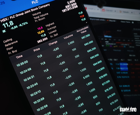 Mã FLC của Tập đoàn FLC tiếp tục rơi xuống giá sàn 11.800 đồng/cổ phiếu trong phiên 30-3, với gần 102 triệu cổ phiếu dư bán sàn, tương đương với tổng giá trị hơn 1.200 tỉ đồng - Ảnh: BÔNG MAI