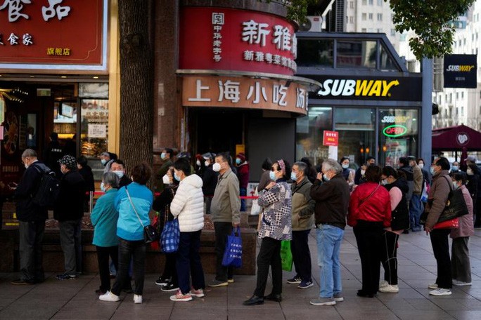 Cư dân Thượng Hải xếp hàng trước khu mua sắm để mua thực phẩm ngày 29-3. Ảnh: Reuters