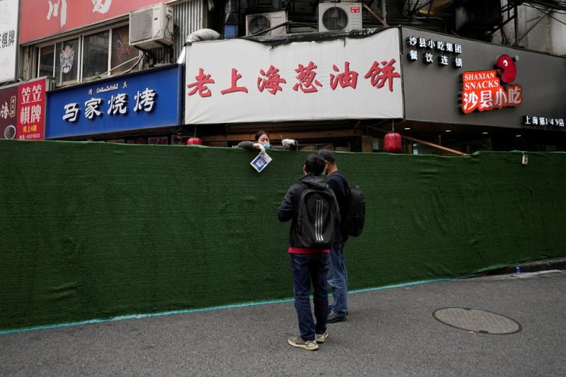 Một người bán thực phẩm giao dịch qua hàng rào phong tỏa ở Thượng Hải ngày 31/3. Ảnh: Reuters.