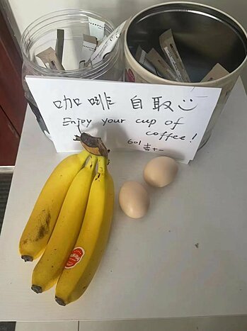 Chuối, trứng và cà phê mà cư dân trong một khu dân cư ở quận Tùng Giang, Thượng Hải trao đổi với nhau giữa lệnh phong tỏa. Ảnh: Cici Chen.