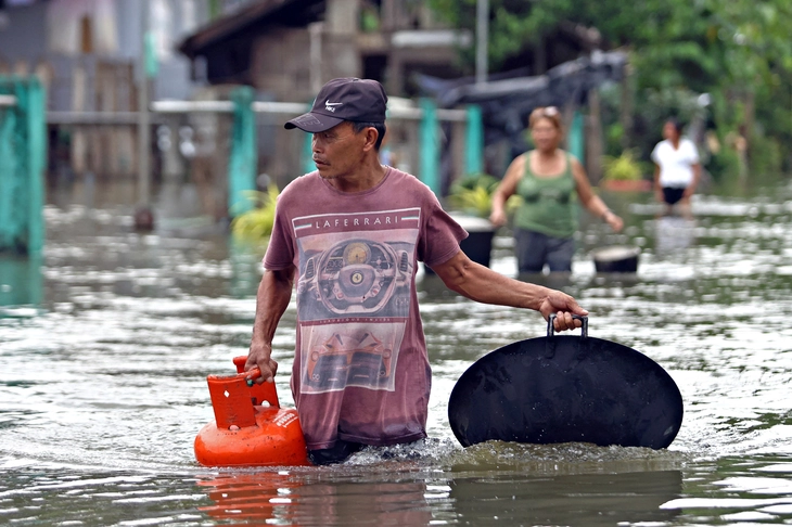 Người dân lội qua con đường bị ngập do bão Phượng Hoàng tại miền nam Philippines ngày 8-11 - Ảnh: ADDP