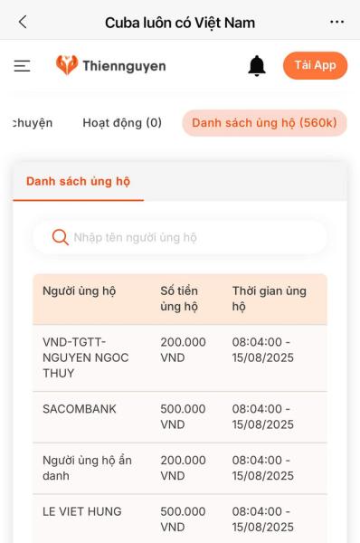 Nhân dân cả nước có thể truy cập vào địa chỉ https://thiennguyen.app/donate-target/1955184412459020288 hoặc tải App "Thiện nguyện" trên App Store, CH Play để cập nhập số tiền ủng hộ nhân dân Cuba. Đặc biệt, sao kê danh sách ủng hộ cũng được công khai tại đây.