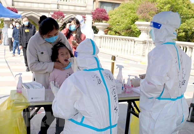 Nhân viên y tế lấy mẫu xét nghiệm COVID-19 cho người dân tại Thượng Hải, Trung Quốc, ngày 6/4/2022. (Ảnh: THX/TTXVN)
