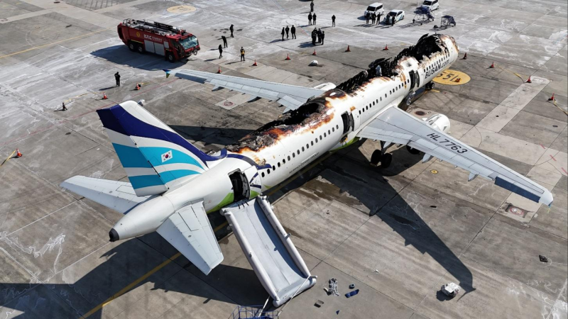 Hình ảnh chiếc máy bay chở khách của hãng Air Busan bị cháy rụi tại sân bay quốc tế Gimhae ở Busan, ngày 28/1/2025. Ảnh: Korea Times