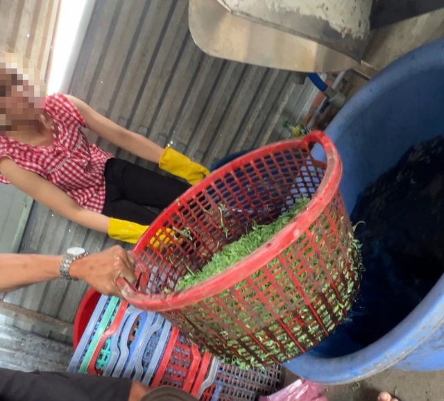 Ở giữa nền đất, họ đặt một thau chứa dung dịch màu xanh, đen ngòm khoảng 40 lít. Nữ công nhân (khoảng 16 tuổi) đứng ngâm rau vào thau dung dịch. Khoảng 30 phút, khi thau dung dịch nhạt màu thì người này lại rót thêm hóa chất vào, khuấy đều.