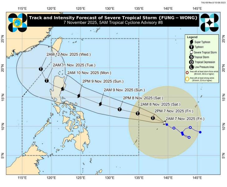 PAGASA dự báo bão Fung-wong sẽ đi vào PAR vào nửa đêm nay hoặc rạng sáng thứ Bảy (8.11). Khi tiến vào vùng này, bão sẽ được đặt tên trong nước là Uwan.
