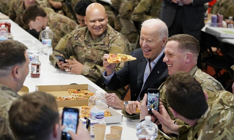 Tổng thống Biden ăn pizza cùng binh sĩ Mỹ ở ngoại ô thành phố đông nam Ba Lan, kể lại câu chuyện thăm con trai tại Iraq gần 13 năm trước.