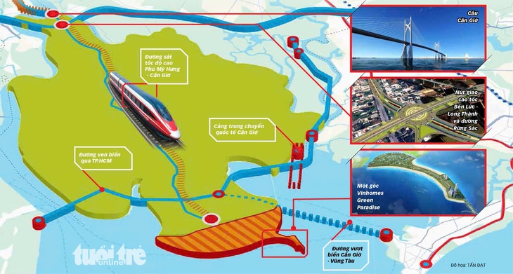 Khu đô thị lấn biển Vinhomes Green Paradise là trung tâm hội tụ siêu hạ tầng: đường sắt tốc độ cao, cầu Cần Giờ, đường vượt biển, đường ven biển, nút giao Bến Lức - Long Thành - Rừng Sác, cụm cảng Cần Giờ - Cái Mép… - Đồ hoạ: TẤT ĐẠT