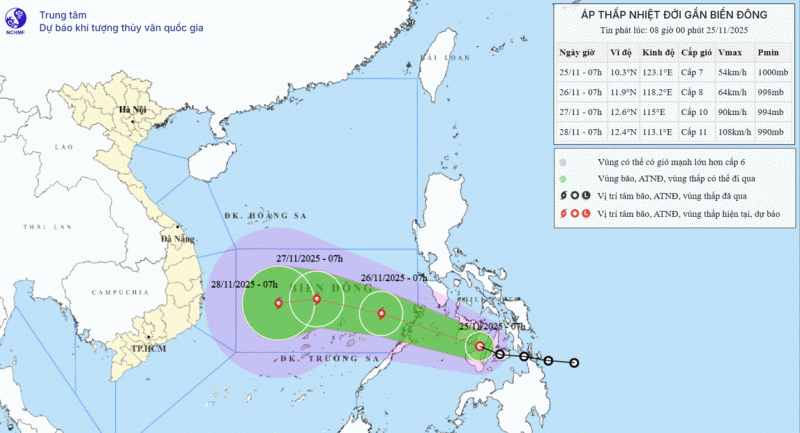 Vào sáng mai (26.11), áp thấp nhiệt đới có thể vào Biển Đông và mạnh lên thành bão số 15 - NGUỒN: NCHMF