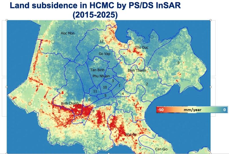 Qua công nghệ InSAR kết hợp PS/DS (giai đoạn 2015-2025) cho thấy, khu vực TP.HCM sụt lún nặng gồm: huyện Nhà Bè, huyện Bình Chánh, quận 7, quận Bình Tân, quận 8 (cũ)...