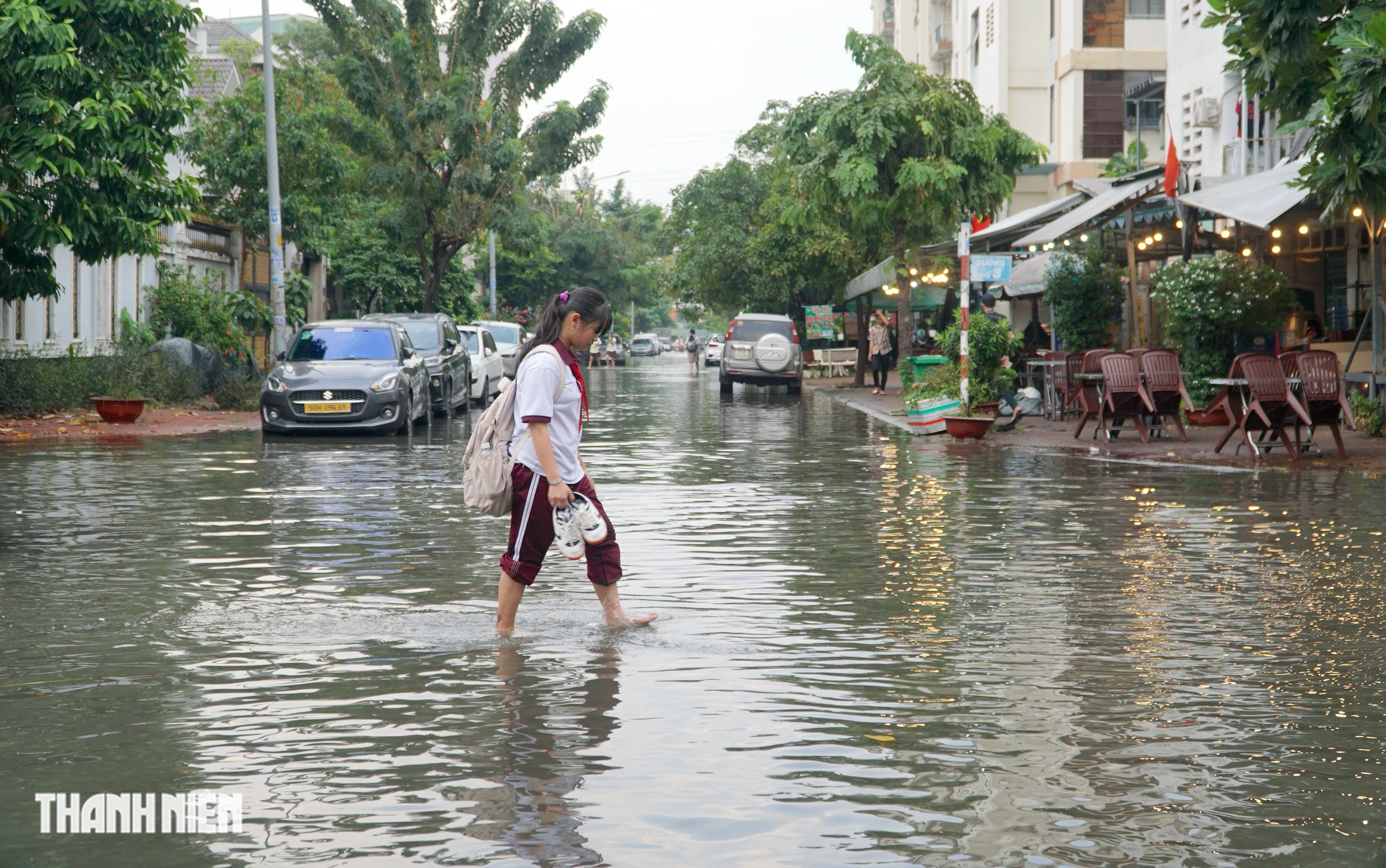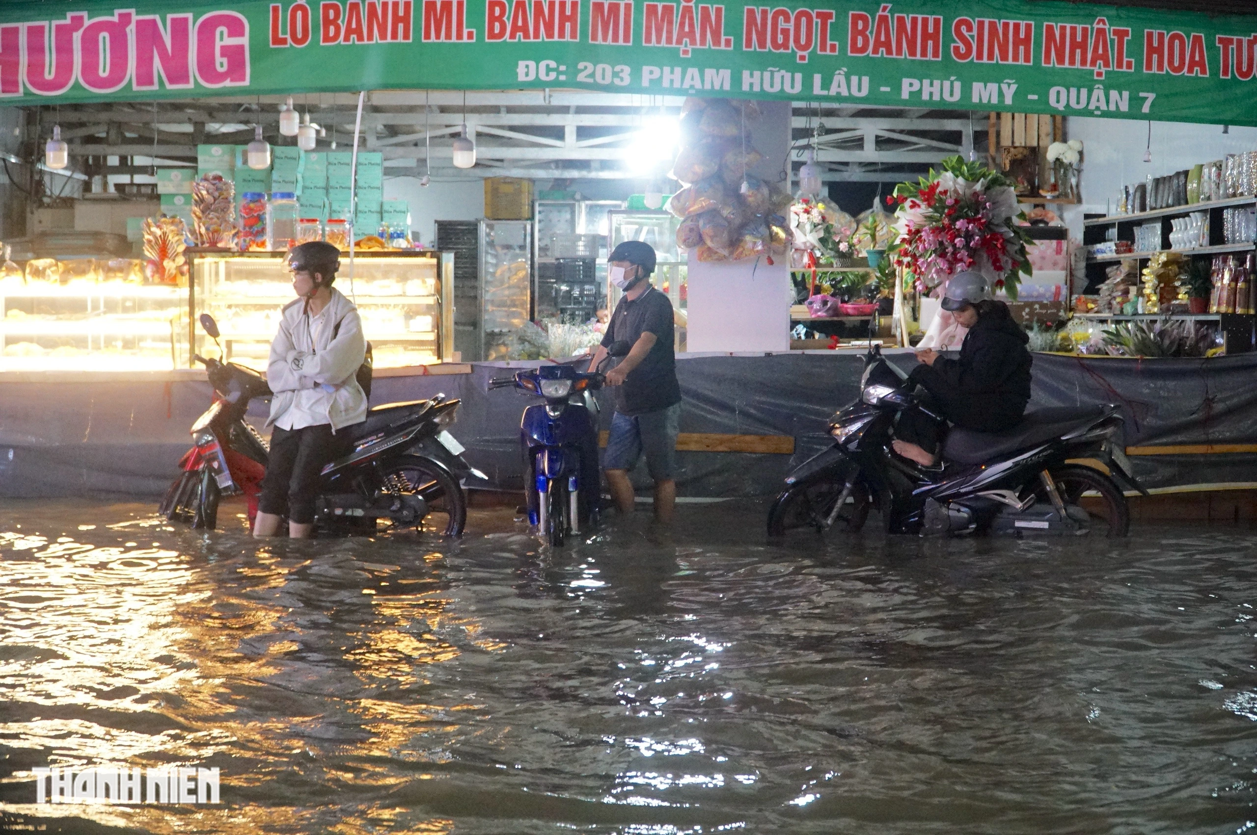 Trên đường Phạm Hữu Lầu, nước ngập hầu hết cả tuyến đường, mực nước lên đến hơn đầu gối. Ở đường Trần Xuân Soạn cũng vậy, nước ngập sâu, thường tập trung tại đoạn gần cầu Tân Thuận, người dân đi lại rất khó khăn.