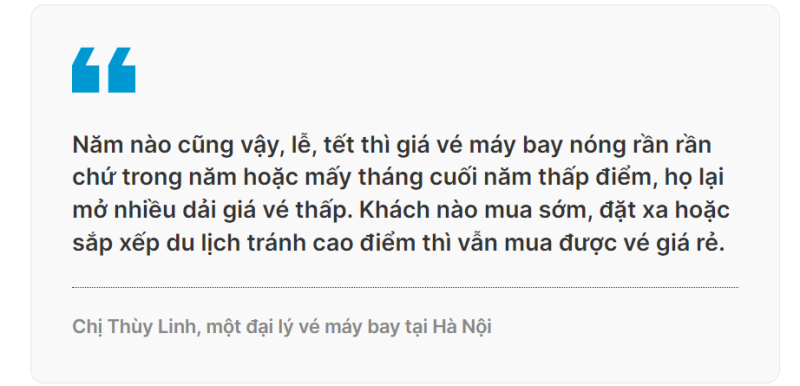 "Không chỉ Vietjet, tất cả các hãng hàng không đều có nhiều vé giá rẻ giai đoạn cuối năm. Năm nào cũng vậy, lễ, tết thì giá vé máy bay nóng rần rần chứ trong năm hoặc mấy tháng cuối năm thấp điểm, họ lại mở nhiều dải giá vé thấp. Khách nào mua sớm, đặt xa hoặc sắp xếp du lịch tránh cao điểm thì vẫn mua được vé giá rẻ", chị Thùy Linh, một đại lý vé máy bay tại Hà Nội, thông tin.