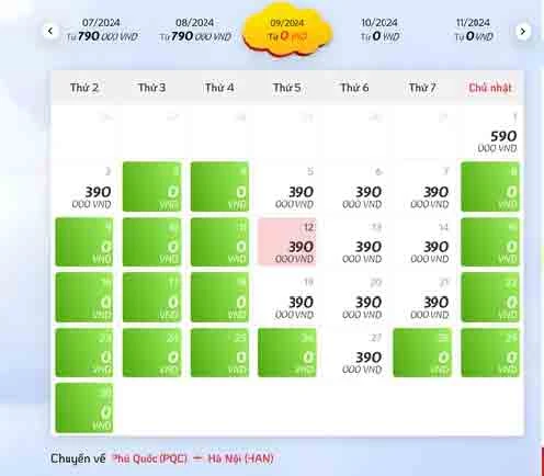 Đáng chú ý, sau thời gian dài "mất tích", Vietjet đã cho "tái xuất" loạt giá vé 0 đồng. Vé này hiển thị chủ yếu trên chặng bay Hà Nội - Phú Quốc, thời điểm khởi hành từ tháng 9 - 12, chủ yếu áp dụng cho chuyến bay vào chủ nhật và những ngày đầu tuần, khung giờ sáng sớm và đêm. Đây cũng là thời điểm du lịch nội địa vào giai đoạn thấp điểm. Ngoài ra, một số đường bay như Hà Nội - Huế, Nha Trang; TP.HCM đến Nha Trang, Quy Nhơn, Huế, Đà Nẵng, Vinh… đều có vé giá chỉ 70.000 - 90.000 đồng.