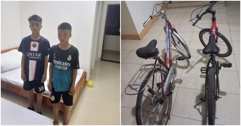 2 anh em đạp xe từ Điện Biên xuống Hà Nội tìm mẹ. Ảnh: Công an nhân dân.